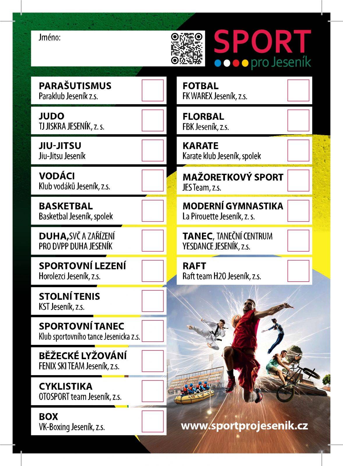 Sport pro Jeseník již tuto neděli 1. září 28.08.2024 - Tradiční burza jesenických sportovních klubů se uskuteční již tuto neděli 1. září od 10.00 do 15.00 v areálu Městské sportovní haly na ulici Dukelská. Kromě ukázky téměř dvaceti sportů bude akce doprovázena sportovním vícebojem, za který bude každý mladý sportovec odměněn. Většina sportovních klubů bude rozmístěna uvnitř a okolo Městské sportovní haly. Vodní sporty, které nabídnou např. vodní slalom nebo projížďku na lodičkách, se budou prezentovat na blízkém rybníčku a fotbalisti na hřišti. Doprovodný program zajistí SVČ DUHA. Cílem této akce je přilákat děti a mládež ke sportu a ukázat jim, jaké sporty jsou pro ně v regionu Jesenicka dostupné. Dále se zde dozví, kdy a kde se mohou do daného sportu samy zapojit a hlavně si ho budou moci vyzkoušet. K dispozici jim budou trenéři jednotlivých sportovních klubů. | |